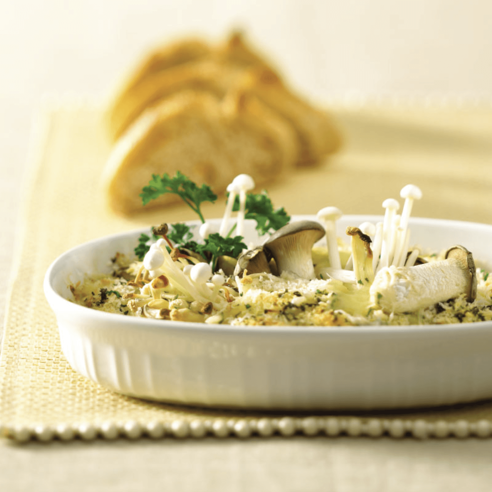 A rich and cheesy gratin combining King Oyster, Enoki and Shiitake mushrooms with bean curd, baked to bubbly perfection.